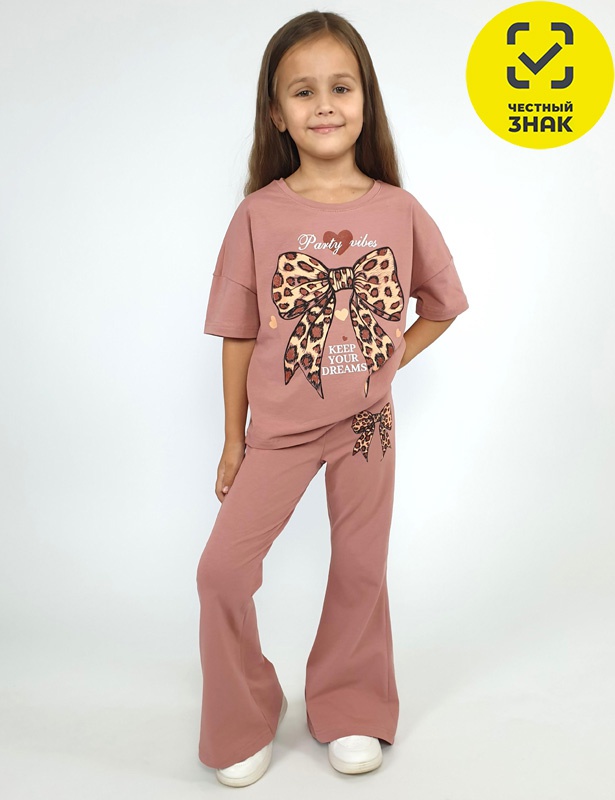Комплект для девочки (джемпер+ брюки). Джемпер(оверсайз),спущенное плечо, короткий рукав. Горловина обработана планкой. Печать на переде. Брюки-на поясе с резинкой, расширены к низу. Печать слева, вверху.