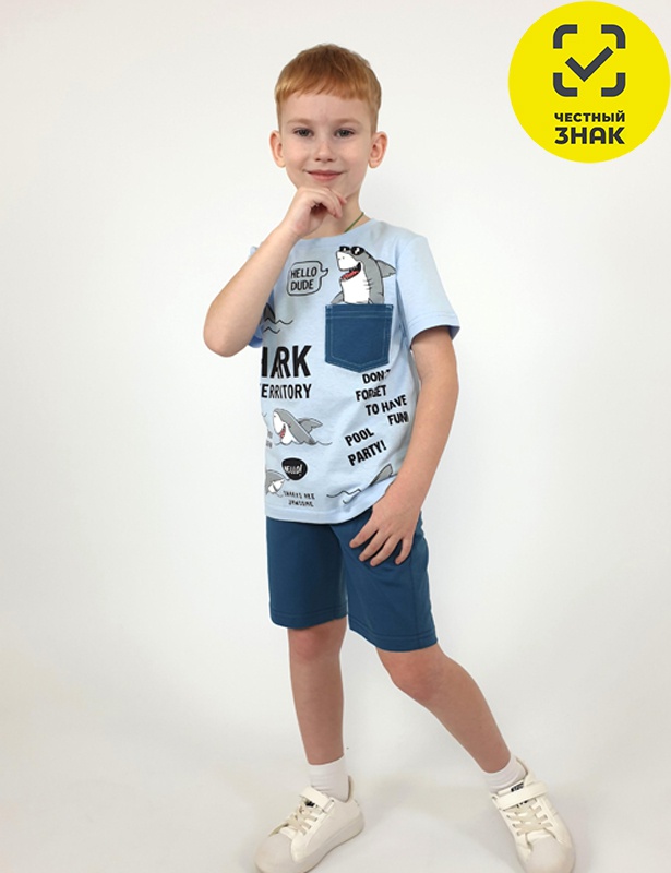 Комплект для мальчика (футболка+шорты). Футболка прямая, короткий втачной рукав, перед с печатью и отделочным карманом. Горловина обработана ластиком. Шорты укороченные с притачным поясом и резинкой. Два боковых кармана по переду, иммитация гульфика.