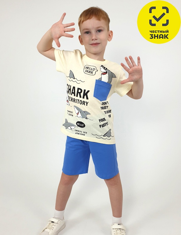Комплект для мальчика (футболка+шорты). Футболка прямая, короткий втачной рукав, перед с печатью и отделочным карманом. Горловина обработана ластиком. Шорты укороченные с притачным поясом и резинкой. Два боковых кармана по переду, иммитация гульфика.