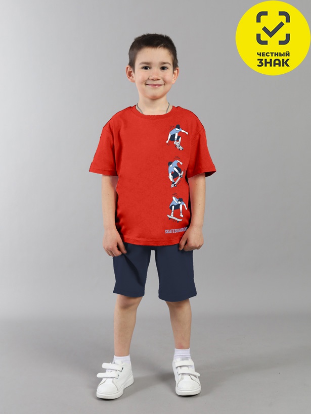 Комплект для мальчика включает футболку и шорты. Футболка классического кроя, с коротким втачным рукавом, горловиной, обработанной притачной бейкой, спереди декорирована принтом. Шорты изготовлены из кулирной глади повышенной плотности, верх шорт обработан притачным поясом из основного полотна и эластичной резинкой внутри, в пояс вставлен функциональный шнурок. На передних половинках расположен карман.