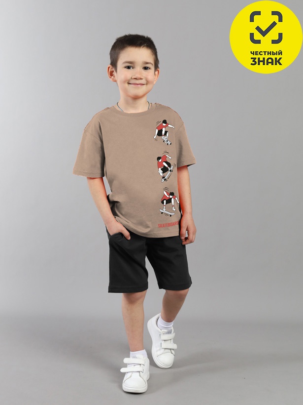Комплект для мальчика включает футболку и шорты. Футболка классического кроя, с коротким втачным рукавом, горловиной, обработанной притачной бейкой, спереди декорирована принтом. Шорты изготовлены из кулирной глади повышенной плотности, верх шорт обработан притачным поясом из основного полотна и эластичной резинкой внутри, в пояс вставлен функциональный шнурок. На передних половинках расположен карман.