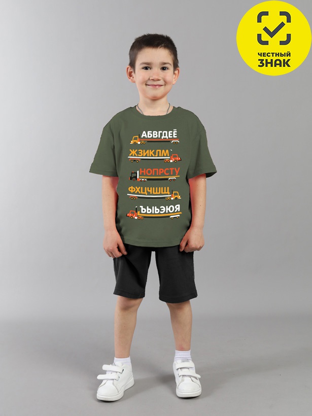 Комплект для мальчика включает футболку и шорты. Футболка классического кроя, с коротким втачным рукавом, горловиной, обработанной притачной бейкой, спереди декорирована принтом. Шорты изготовлены из кулирной глади повышенной плотности, верх шорт обработан притачным поясом из основного полотна и эластичной резинкой внутри, в пояс вставлен функциональный шнурок. На передних половинках расположен карман.
