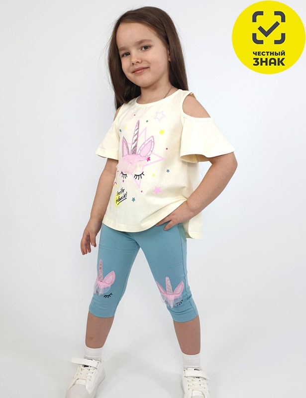 Комплект для девочки (джемпер+ лосины). Джемпер-силуэт трапеция, печать и вышивка(аппликация) по переду. Рукав втачной с декоративным вырезом на плече. Горловина и вырез на плече окантованы. Лосины-укороченные с вышивкой-аппликацией и отделочным элементом из сетки.