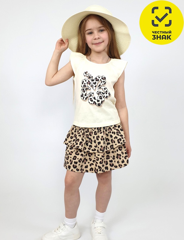 Комплект для девочки (джемпер+ юбка). Джемпер полуприлегающего силуэта, перед с печатью. Рукав короткий "крылышко". Горловина окантована. Юбка на кокетке с резинкой и двумя рюшами.