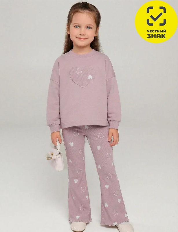 Комплект для девочки включает в себя: джемпер из футера 2х нитка петля и штаны из ткани кашкорсе. Джемпер прямого кроя с длинными втачными рукавами на манжетах, округлая горловина. На джемпере имеется нашивка в виде сердца. Штаны на поясе на резинке, расклешенные к низу.