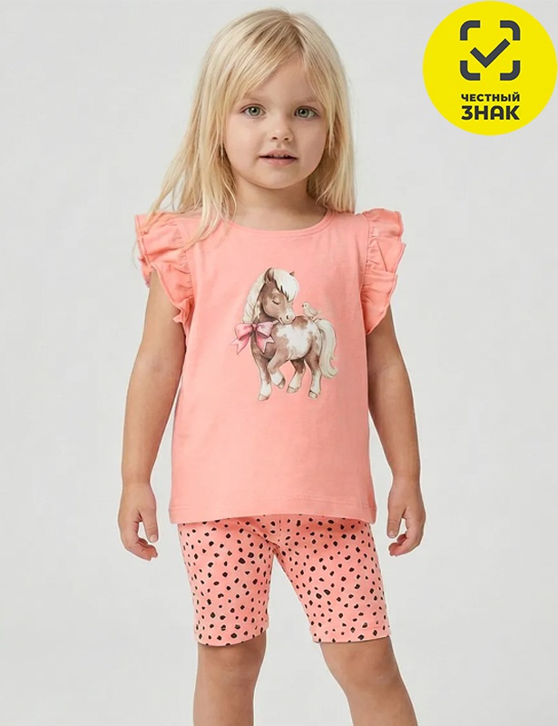 Комплект для девочки состоит из 2-х предметов. Футболка из гладкокрашеного полотна, прямого кроя, с короткими втачными рукавами, в пройме рюша, округлая горловина, на полочке печать. Велосипедки из набивного полотна, на поясе на резинке.