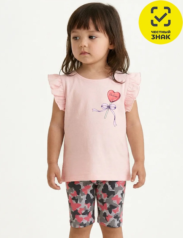 Комплект для девочки состоит из 2-х предметов. Футболка из гладкокрашеного полотна, прямого кроя, с короткими втачными рукавами, в пройме рюша, округлая горловина, на полочке печать. Велосипедки из набивного полотна, на поясе на резинке.