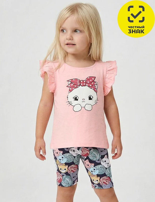 Комплект для девочки состоит из 2-х предметов. Футболка из гладкокрашеного полотна, прямого кроя, с короткими втачными рукавами, в пройме рюша, округлая горловина, на полочке печать. Велосипедки из набивного полотна, на поясе на резинке.