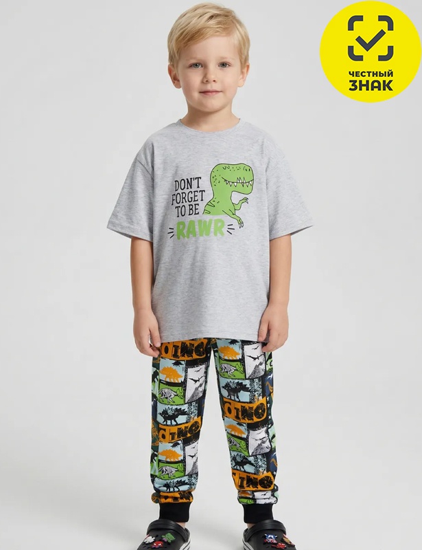 Костюм для мальчика состоит из 2-х предметов. Футболка с округлой горловиной, спущенной линией плеча и печатью на полочке. Брюки из набивного полотна, на поясе на резинке, манжеты снизу.
