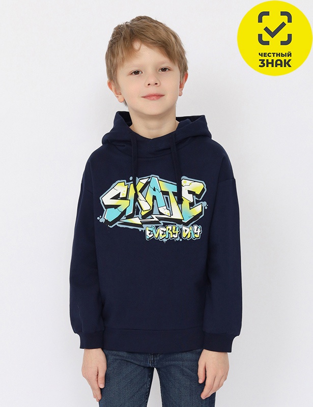 Толстовка с длинными рукавами, притачным поясом и манжетами. Манжеты выполнены из полотна с добавлением лайкры, пояс выполнен из основного полотна. Капюшон со шнурком и подкладкой, верхняя часть декорирована вязаной нашивкой. Перед декорирован принтом "Катайся каждый день".
