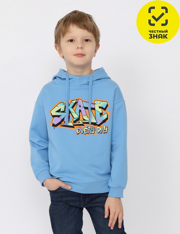 Толстовка с длинными рукавами, притачным поясом и манжетами. Манжеты выполнены из полотна с добавлением лайкры, пояс выполнен из основного полотна. Капюшон со шнурком и подкладкой, верхняя часть декорирована вязаной нашивкой. Перед декорирован принтом "Катайся каждый день".