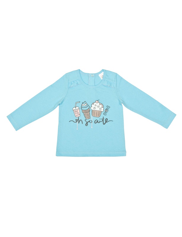 Джемпер для девочки прямого кроя, длинные втачные рукава, округлая горловина, спереди декорирован притачнфми рюшами и печатью. На спинке застежка на кнопки.