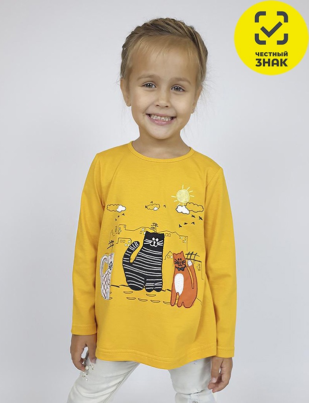 Джемпер для девочки силуэта трапеция, длинный втачной рукав. Горловина окантована, застежка на пуговицу по спинке. Печать на переде и вышивка (аппликация).