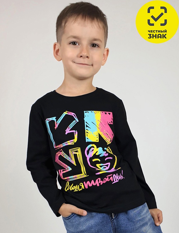 Джемпер (лонгслив) прямой, втачной длинный рукав. Печать на переде и спинке. Горловина обработана ластиком.