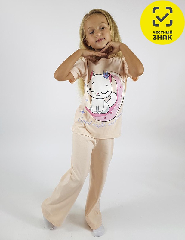 Пижама для девочки, состоит из футболки и брюк. Футболка с цельнокроенным, коротким рукавом, перед с печатью, горловина окантована, низ подшит. Брюки прямые свободного силуэта, по талии на резинке.