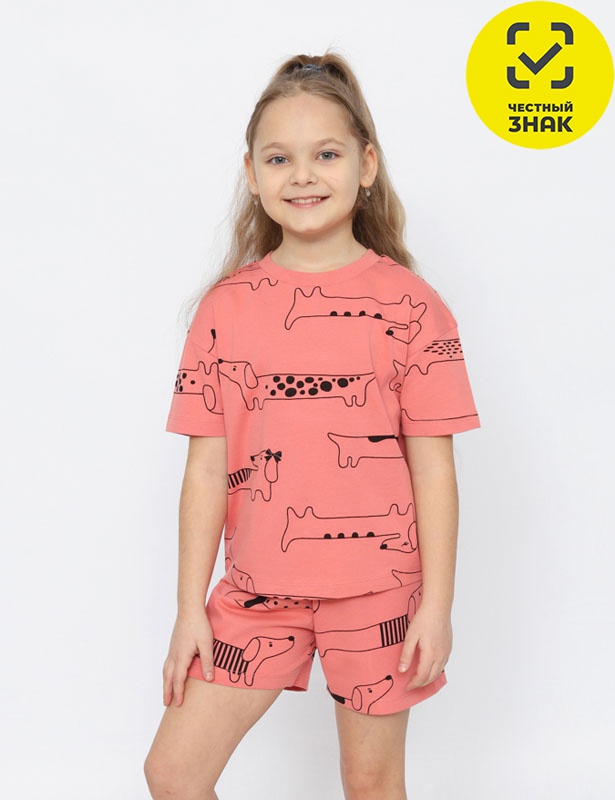 Пижама набивная из футболки и шорт. Футболка оверсайз с коротким рукавом. Горловина обработана притачной бейкой из рибаны с лайкрой. Шорты свободного покроя длиной до середины бедра. Цельнокроеный пояс обработан плоским швом вподгибку с одновременным прокладыванием резинки.