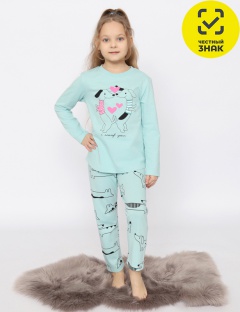 Комбинированная пижама из джемпера и брюк. Джемпер гладкокрашенный, свободного покроя с длинным рукавом. Горловина обработана притачной бейкой из рибаны с лайкрой. Перед оформлен принтом. Прямые брюки умеренного объёма выполнены из набивного полотна. Цельнокроенный пояс обработан плоским швом вподгибку с одновременным прокладыванием резинки.