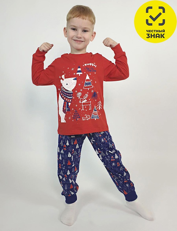 Пижама для мальчика. Джемпер прямой, рукав втачной, длинный на манжете из ластика. Горловина обработана ластиком. Печать на переде. Брюки длинные из набивного полотна. Верхний срез подшит с резинкой.