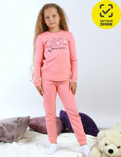 Пижама свободного покроя, гладкокрашеная. Джемпер с длинным рукавом на манжете из рибаны с лайкрой. Горловина обработана притачной бейкой из рибаны с лайкрой. Перед оформлен принтом. Брюки на манжетах из рибаны с лайкрой. Цельнокроеный пояс обработан плоским швом вподгибку с одновременным прокладыванием резинки.