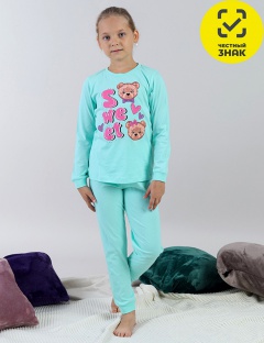 Пижама свободного покроя, гладкокрашеная, комбинированная. Джемпер с длинным рукавом на манжете из рибаны с лайкрой. Горловина обработана притачной бейкой из рибаны с лайкрой. Перед оформлен принтом. Брюки на манжетах из рибаны с лайкрой. Цельнокроеный пояс обработан плоским швом вподгибку с одновременным прокладыванием резинки.