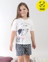 Пижама комбинированная из набивной футболки и гладкокрашеных шорт. Футболка оверсайз с коротким рукавом. Горловина обработана притачной бейкой из рибаны с лайкрой. Перед оформлен принтом с использованием шиммера. Шорты свободного покроя длиной до середины бедра. Цельнокроеный пояс обработан плоским швом вподгибку с одновременным прокладыванием резинки.