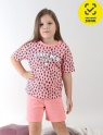 Пижама комбинированная из набивной футболки и гладкокрашеных шорт. Футболка оверсайз с коротким рукавом. Горловина обработана притачной бейкой из рибаны с лайкрой. Перед оформлен принтом с использованием шиммера. Шорты свободного покроя длиной до середины бедра. Цельнокроеный пояс обработан плоским швом вподгибку с одновременным прокладыванием резинки.