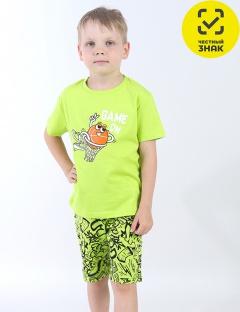 Комплект для мальчика. Футболка свободного силуэта с круглым воротником из эластичной рибаны и втачным рукавом. Перед декорирован принтом. Шорты набивные, свободные, длиной выше колена.