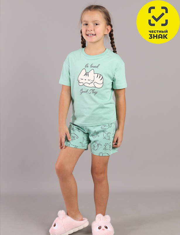 Пижама для девочки: футболка и шорты из мягкого трикотажа. Футболка с коротким рукавом, горловина круглая, на полочке печать. Шорты с рисунком котиков, пояс на резинке.