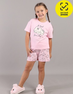 Пижама для девочки: футболка и шорты из мягкого трикотажа. Футболка с коротким рукавом, горловина круглая, на полочке печать. Шорты с рисунком котиков, пояс на резинке.
