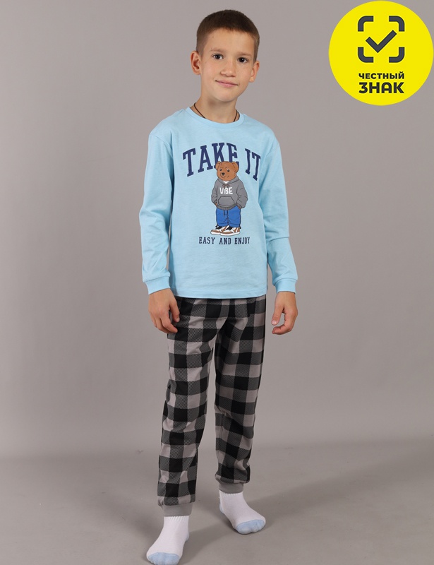 Пижама для мальчика: джемпер и брюки из мягкого трикотажа. Джемпер с длинным рукавом на манжете из рибаны. Горловина круглая, из рибаны. На полочке выполнена шелкография. Брюки с поясом на резинке и манжетами по низу из рибаны. Полотно с набивкой.