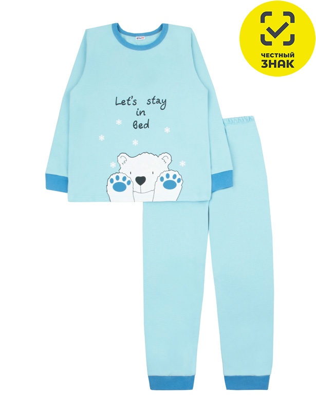 Детская пижама состоит из прямого джемпера и длинных брюк. Джемпер имеет втачные длинные рукава на манжетах из ластика. На передней части изделия печать. Горловина обработана эластичным ластиком для комфортного ношения. Брюки оформлены манжетами внизу, верхний срез подшит с эластичной резинкой для удобной посадки.