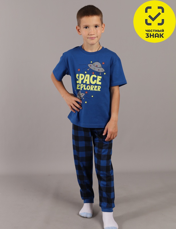 Пижама для мальчика: футболка и брюки из мягкого трикотажа. Футболка с коротким рукавом, горловина круглая из рибаны. На полочке выполнена шелкография . Брюки с поясом на резинке и манжетами по низу из рибаны.