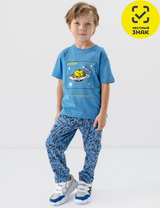 Пижама для мальчика: футболка и брюки мягкого трикотажа. Футболка гладкокрашенная с коротким рукавом. Горловина круглая, из рибаны. На полочке выполнена шелкография в виде динозавра. Брюки из полотна в набивку "абстракция" с поясом на резинке и манжетами по низу из рибаны.