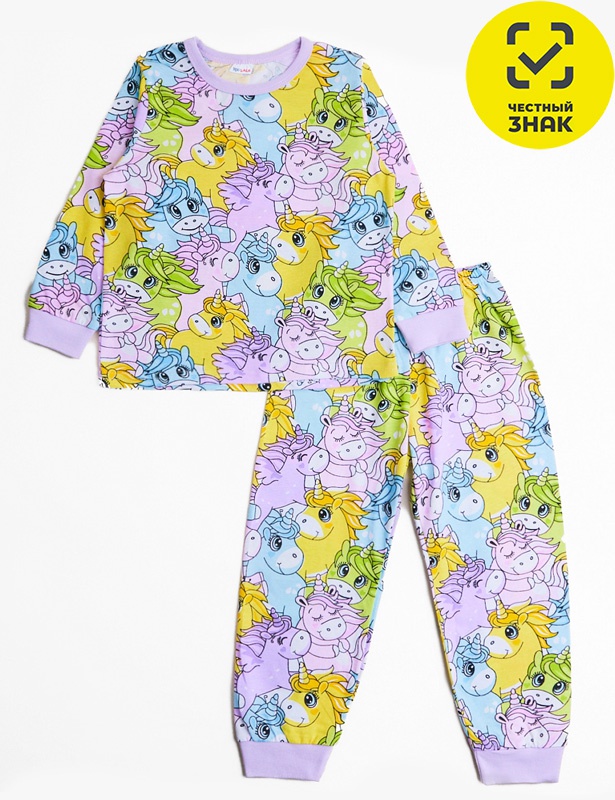 Детская пижама из набивной кулирки, состоит из прямого джемпера и длинных брюк. Джемпер имеет втачные длинные рукава на манжетах из ластика. Горловина обработана эластичным ластиком для комфортного ношения. Брюки оформлены манжетами внизу, верхний срез подшит с эластичной резинкой для удобной посадки.