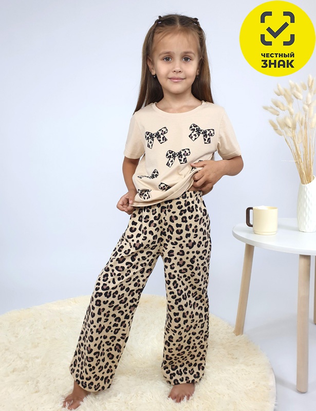 Пижама для девочки (фуфайка и брюки). Фуфайка(пижамная)-прямая, рукав втачной, короткий. Горловина обработана планкой. Печать на переде. Брюки(пижамные)-длинные прямые, верхний срез подшит с резинкой.