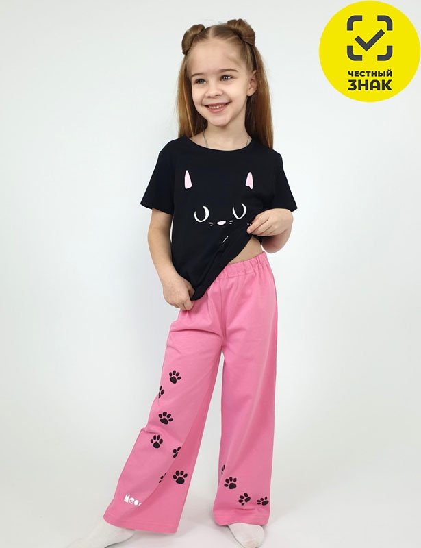 Пижама для девочки (футболка и брюки). Футболка - прямая, рукав втачной, короткий. Горловина обработана планкой. Печать на переде. Брюки(пижамные)-длинные прямые, верхний срез подшит с резинкой. Печать на передних половинках.