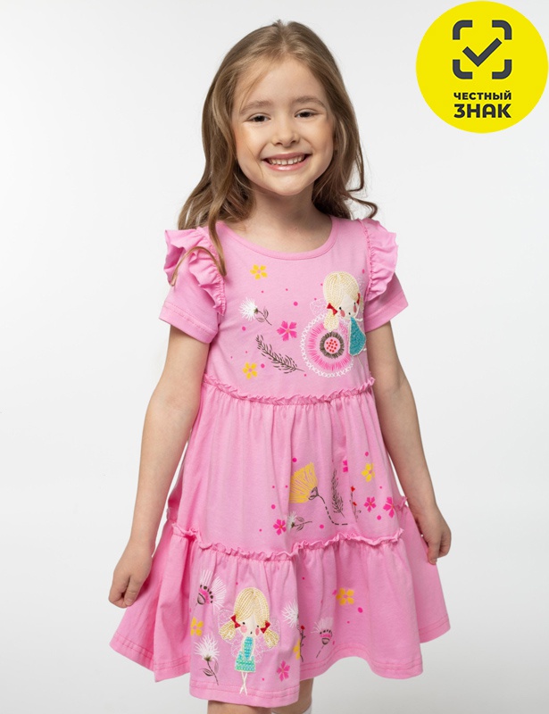 Платье силуэта трапеция, короткий втачной рукав с настрочной рюшей по пройме. Юбка переда и спинки из двух воланов, по передним воланам печать. Кокетка переда с печатью, застежка по спинке на пуговицы. Горловина окантована. Вышивка (пайетки) на кокетке переда и нижнем волане.