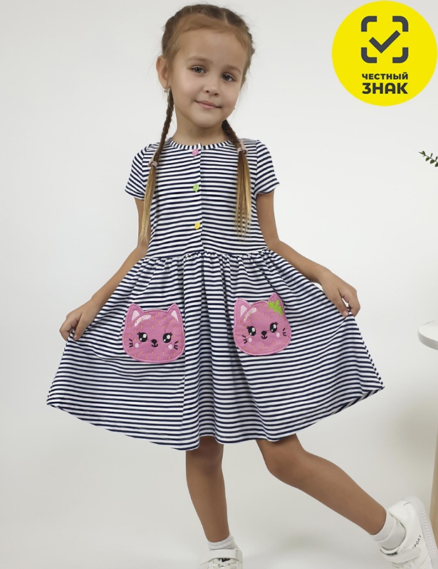 Платье приталенного силуэта, отрезная юбка со сборкой и два накладных-вышитых кармана. Короткий рукав, застежка по переду на пуговицы. Горловина окантована.