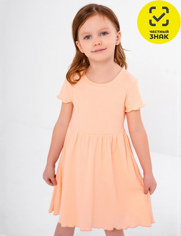Платье для девочки из гладкокрашеного полотна, короткие втачные рукава, округлый вырез горловины, окантованный бейкой из основного полотна, отрезная юбка со сборками.
