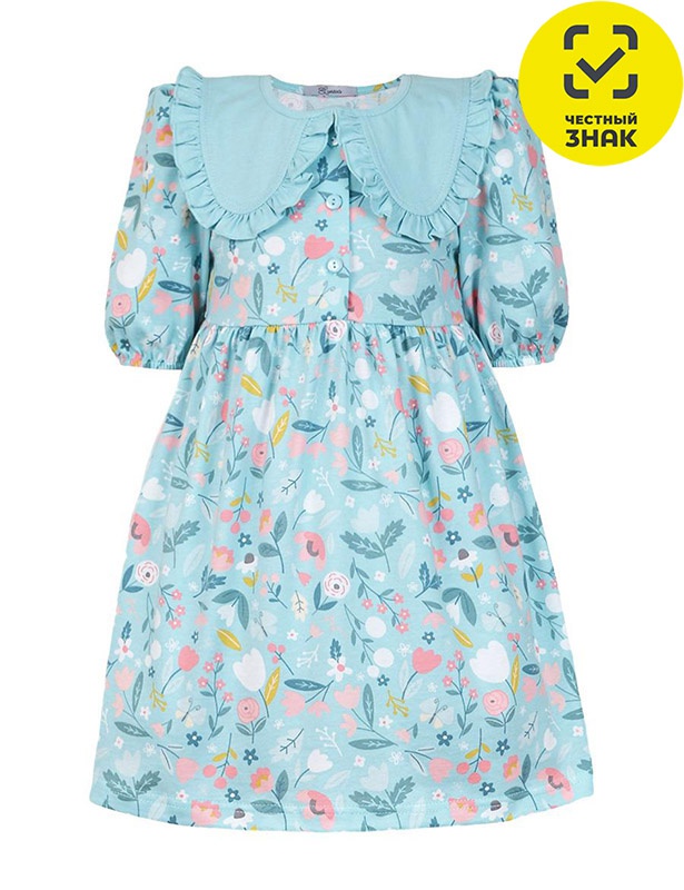 Платье для девочки. У него отрезная юбка в сборку, короткий рукав с резинкой внизу и сборкой по окату. Горловина окантована и подшита, а застёжка центральная на пуговицы. Есть отделочный съёмный воротник с рюшами, который завязывается на бант.