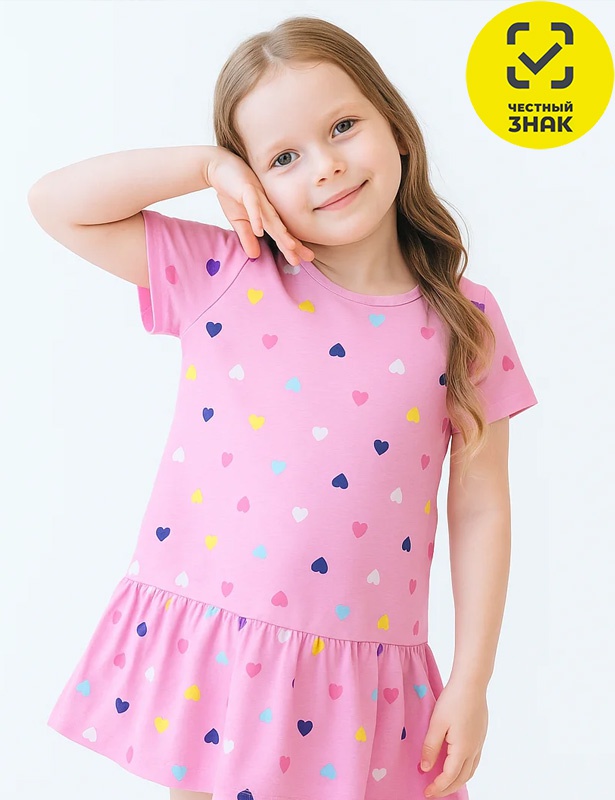 Детское платье с коротким рукавом из набивного полотна, заниженная талия, пышная юбка со сборкой.