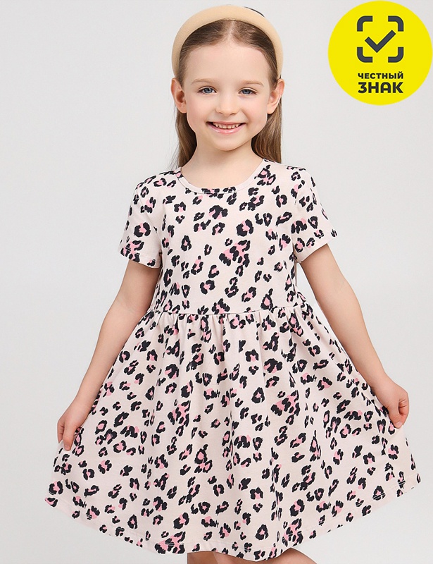 Платье из набивного полотна, короткий рукав, юбка отрезная со сборкой. Горловина обработана планкой. Застёжка сзади на пуговице.