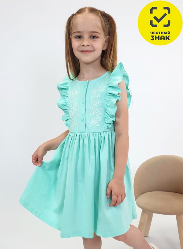 Платье полуприлегающего силуэта, без рукава. Отрезная юбка со сборкой, рельефы с рюшей. Вышивка на переде. Горловина и пройма окантованы, застежка центральная на пуговицы.