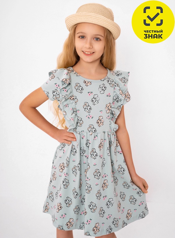 Платье полуприлегающего силуэта из набивного интерлока, с короткими рукавами. Отрезная юбка со сборкой, рельефы с рюшей. Горловина окантована и подшита.