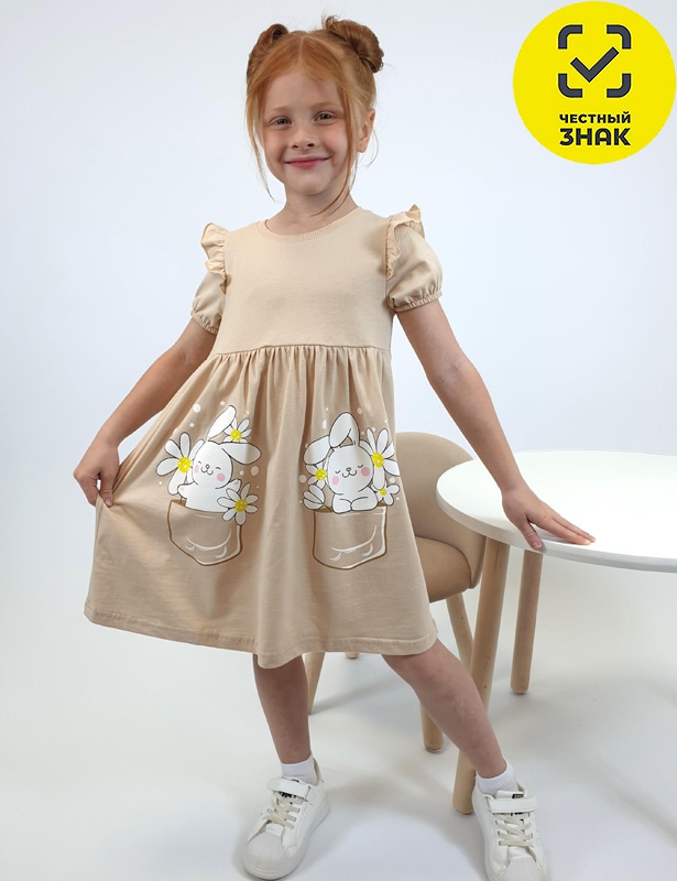 Платье для девочки, перед и спинка с кокеткой, сборка по верху юбки. Рукав короткий, внизу собран на резинку, в пройме рюша. Горловина обработана ластиком. Печать на переднем полотнище юбки.