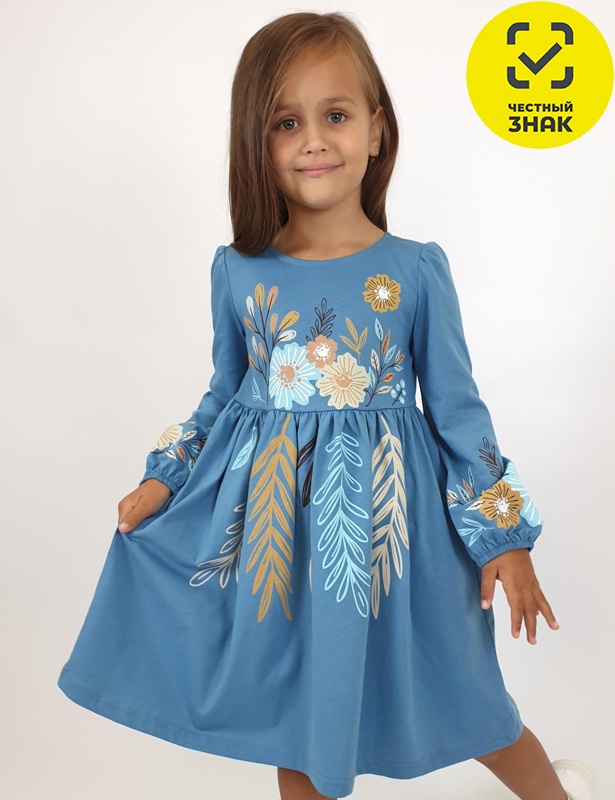 Платье для девочки, приталенный силуэт, длинные рукава - сборка по окату, по низу на резинке. Горловина окантована и подшита, по спинке разрез-застежка на пуговицу. Печать на полочке, юбке переда, рукавах. Отрезная юбка со сборкой.