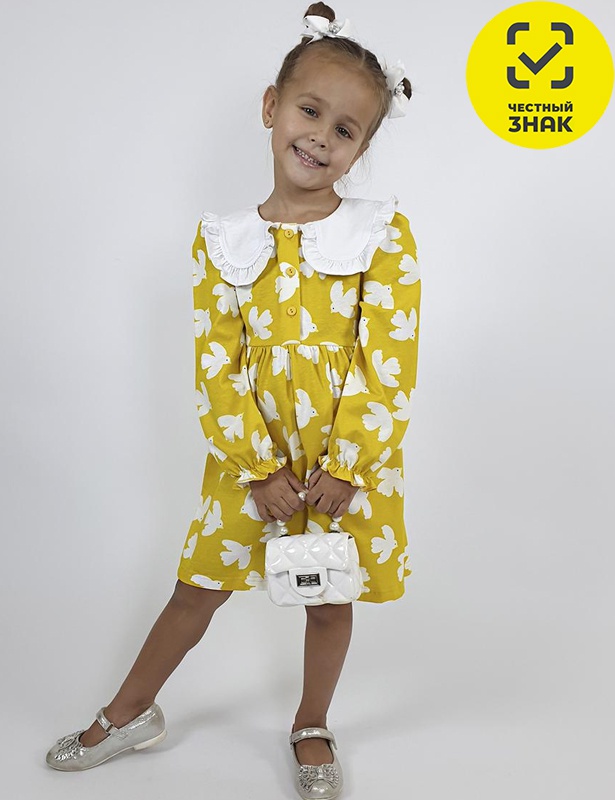 Платье для девочки полуприлегающего силуэта, длинный рукав с резинкой внизу, сборка по окату. Отрезная юбка в сборку. В горловине плосколежащий воротник с рюшей, застежка центральная на пуговицы.