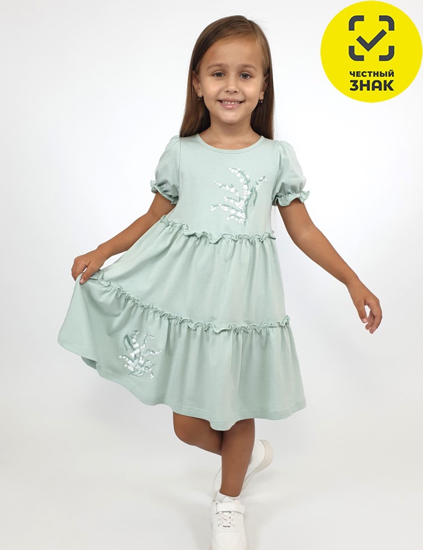 Платье для девочки, силуэт трапеция, короткий рукав "фонарик". Юбка из двух воланов, по переднему нижнему волану вышивка. Кокетка переда с вышивкой, застежка по спинке на пуговицы. Горловина окантована.