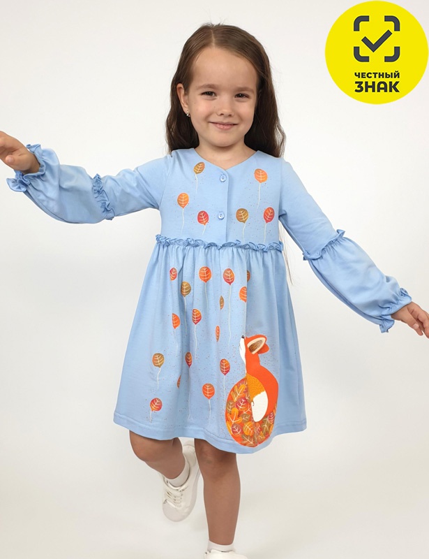 Платье для девочки - силуэт трапеция, длинный втачной рукав, внизу собран на резинку. Линия талии завышена, отрезная юбка. Срезы нижней части рукава и верх юбки со сборкой, обработаны спиральным швом. Печать на переде лифа и юбки. Горловина обработана обтачкой, застежка на пуговицу по спинке.