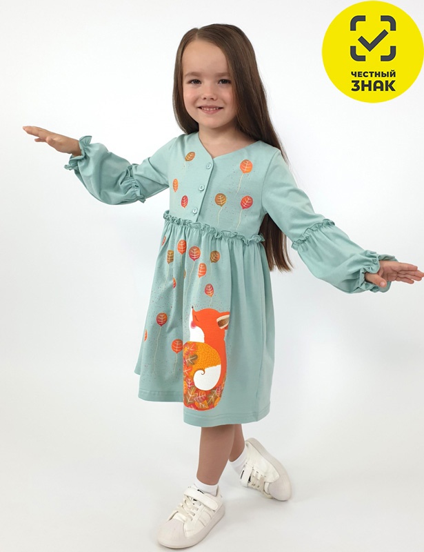 Платье для девочки - силуэт трапеция, длинный втачной рукав, внизу собран на резинку. Линия талии завышена, отрезная юбка. Срезы нижней части рукава и верх юбки со сборкой, обработаны спиральным швом. Печать на переде лифа и юбки. Горловина обработана обтачкой, застежка на пуговицу по спинке.